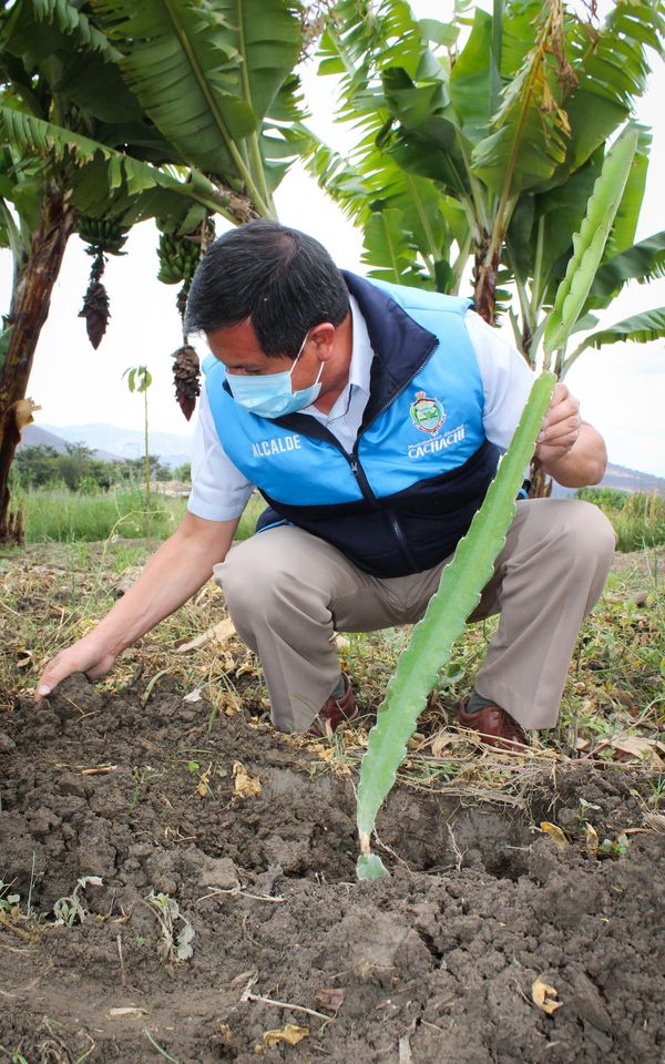 La Municipalidad Distrital de Cachachi que dirige el Prof. Juan EfraΓn Cortegana Roncal, realiza la segunda entrega de plantones de pitahaya, esta vez beneficiando a los agricultores del centro poblado Chuquibamba, quiΓ©nes contaran con asistencia tΓ©cnica permanente durante el cultivo. Cabe mencionar, que esta entrega de 180 plantones, de pitahaya roja pulpa blanca se realiza en el marco del proyecto que promueve el cultivo de pitahaya, en el distrito. Proyecto que viene trabajando con Γ©xito el gobierno municipal de Cachachi, hace varios meses atrΓ‘s, en otras comunidades.