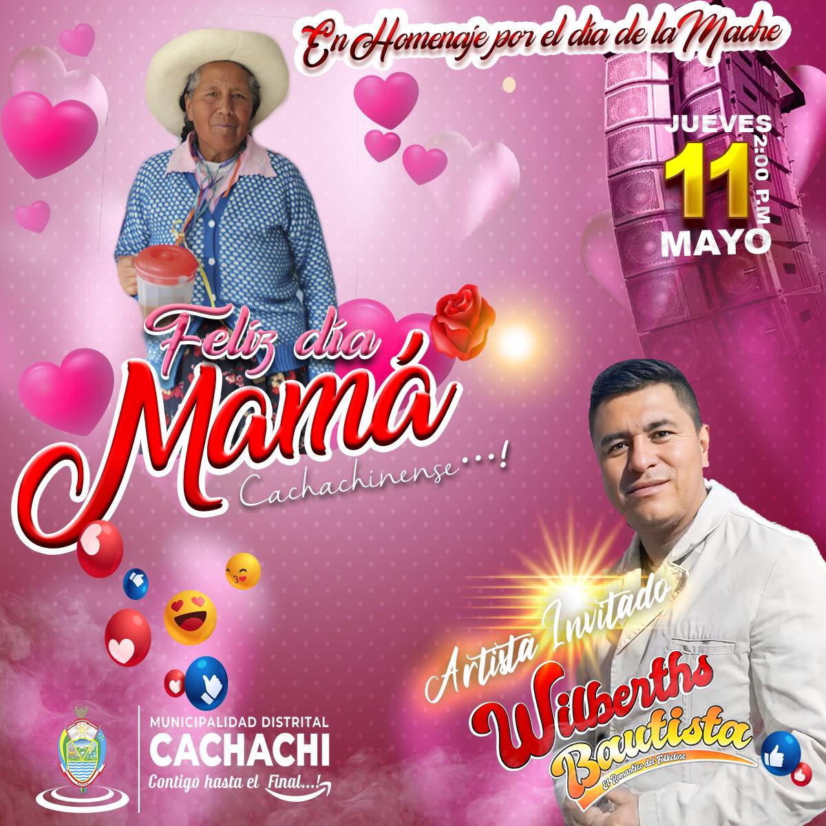 El alcalde, Manuel Salazar, invita a todas las madres cachachinenses a celebrar su día este jueves 11 de mayo a partir de las 2:00 p.m. 🎊🎉🥳 🎊🎉🥳 Disfrutaremos juntos con el cantante #Wilberths #Bautista 🎊🎉🥳 y habrá grandes sorpresas para las presentes. No te puedes perder esta oportunidad de celebrar tu día a lo grande. ¡TE ESPERAMOS!