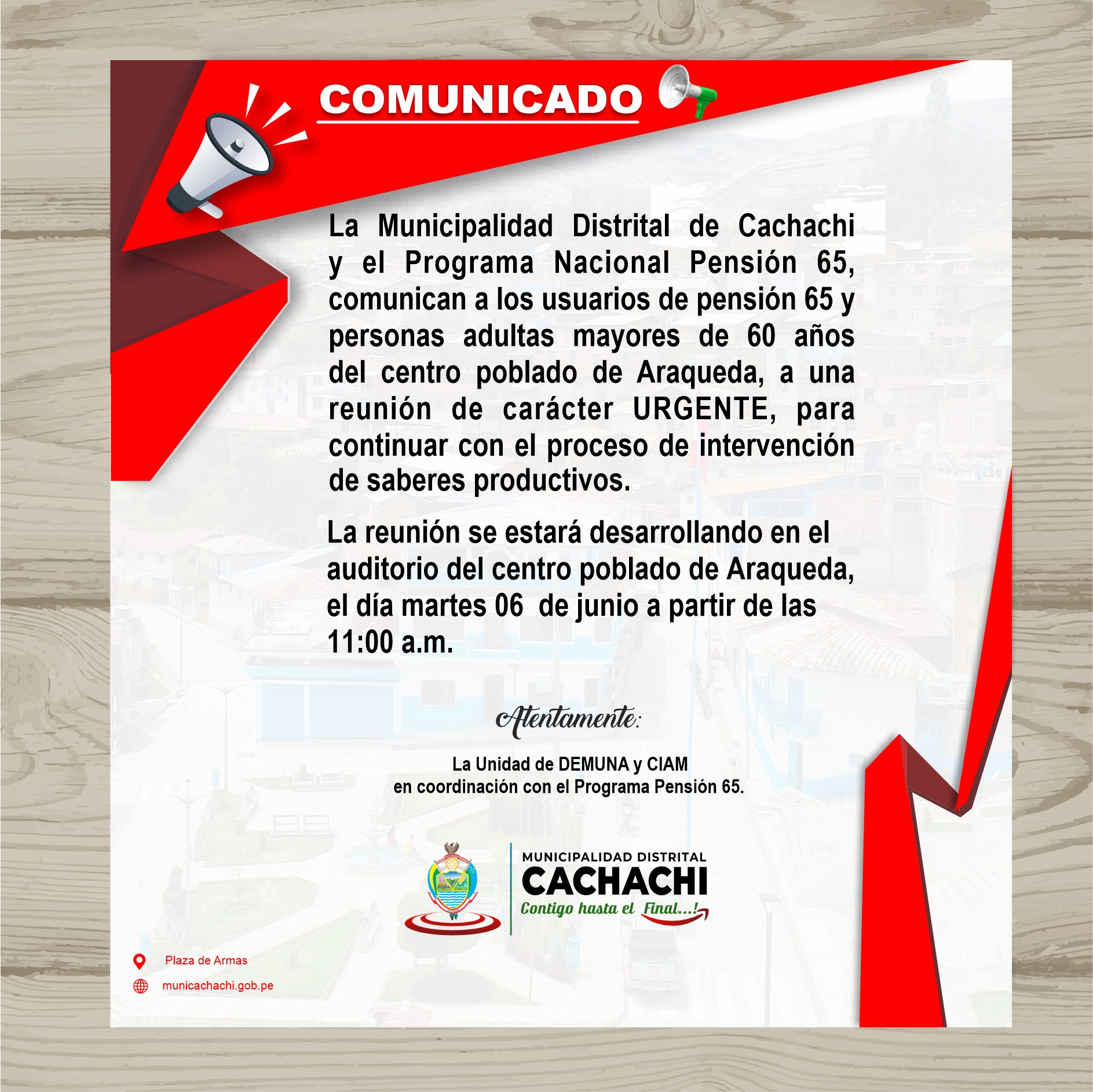 Se comunica a los usuarios de pensión 65 y personas adultas mayores de 60 años del centro poblado de Araqueda, a una reunión de carácter URGENTE, para continuar con el proceso de intervención de saberes productivos.