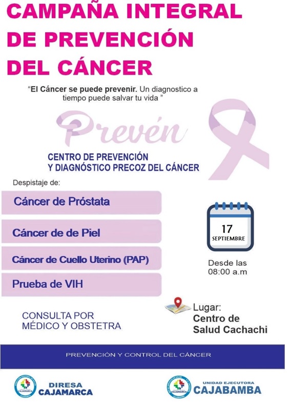 ๐El Centro de Salud Cachachi estarรก realizando una Campaรฑa Integral de Salud de prevenciรณn ๐ฉบ del cรกncer ๐๐ โ Cรกncer de Prรณstata: Dirigida a poblaciรณn masculina entre 50 a 75 aรฑos de edad. โ Prueba de Papanicolau: Dirigida a poblaciรณn femenina entre 25 a 64 aรฑos de edad. โ Cรกncer de piel. โ Prueba de VIH. ๐La campaรฑa se realizarรก este domingo 17 de septiembre en el Centro de Salud Cachachi a partir de las 8:00 a.m. โฐ ๐ฃA los interesados se recomienda acudir en ayunas.