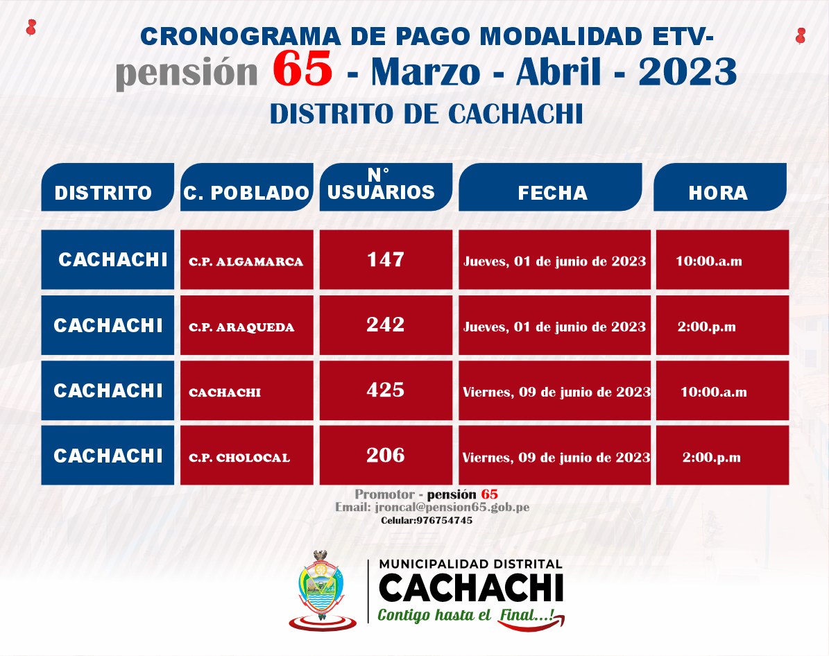 El programa Nacional de Asistencia Solidaria –Pensión 65 del Ministerio de Desarrollo e Inclusión Social-MIDIS, comunica a los usuarios del programa del distrito de Cachachi, que pueden realizar el cobro del pago correspondiente a los meses de MARZO –ABRIL -2023; en los puntos de pago por TRANSPORTADORA DE VALORES-ETV en las fechas que a continuación se detallan en el siguiente cuadro: Asimismo, deben acercarse a la Unidad Local de Empadronamiento (ULE) para que soliciten actualizar su Clasificación Socioeconómica y/o llamar al número 948152847, para coordinar y no ser suspendidos del padrón.