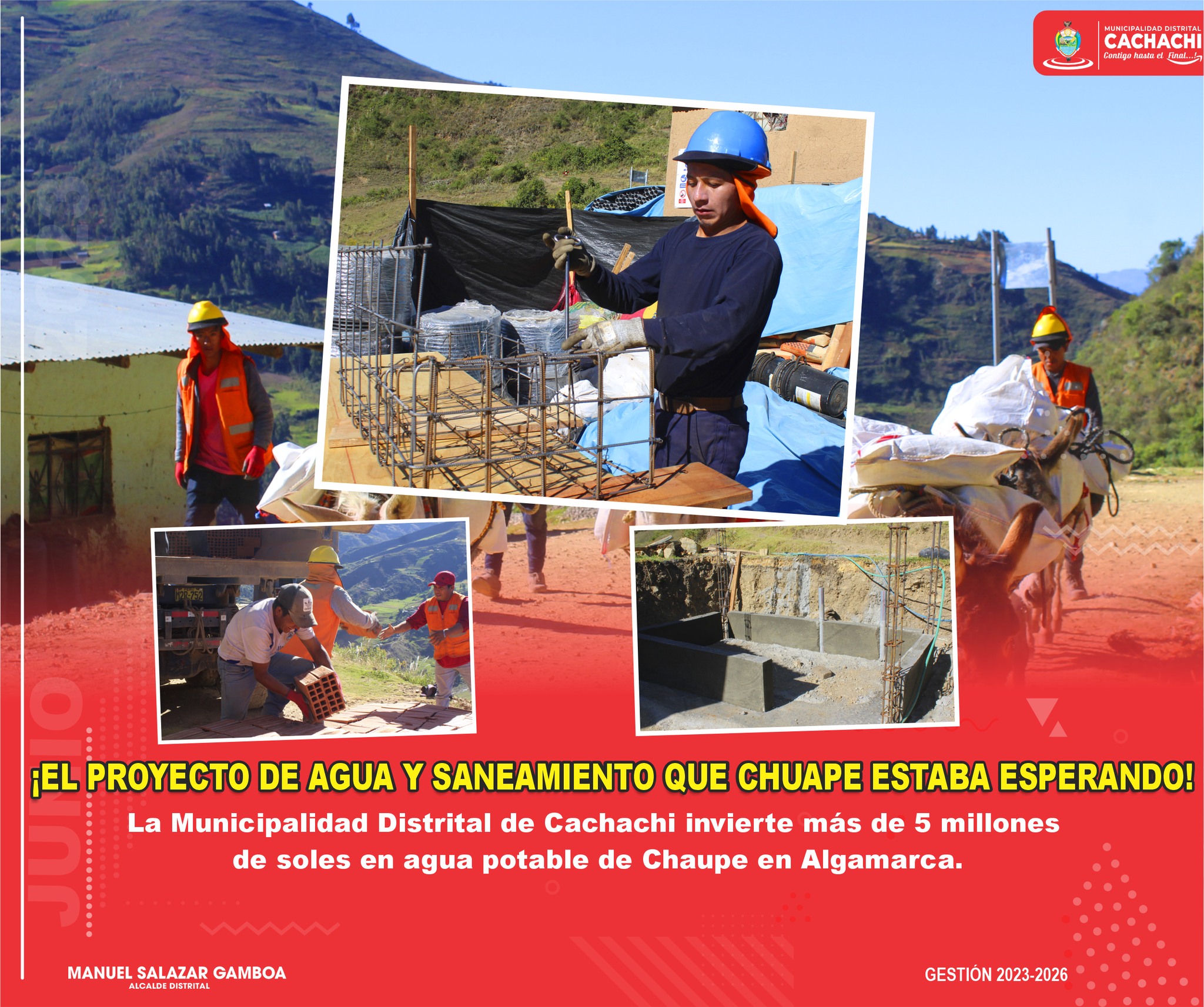 La Municipalidad Distrital de Cachachi viene ejecutando el proyecto “Creación del Servicio de Agua Potable y Saneamiento en el Caserío de Chaupe, del Centro Poblado de Algamarca”. La ejecución se viene desarrollando con total normalidad según el propio testimonio de los beneficiarios. “Estamos contentos que por fin vamos a tener nuestra agua potable y queremos agradecer al alcalde Manuel Salazar por darle continuidad a esta importante obra para Chaupe”, sostuvo un beneficiario. “La localidad de Chaupe espera que se culmine de lo mejor esta obra y estamos yendo por buen camino. Estamos convencidos que esta obra quedará para la historia”, sostuvo el residente del proyecto. La obra tiene un monto de inversión que supera los 5 millones de soles y el plazo de ejecución es de 180 días calendario.