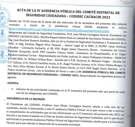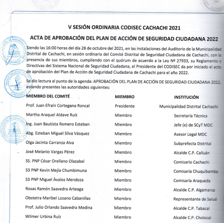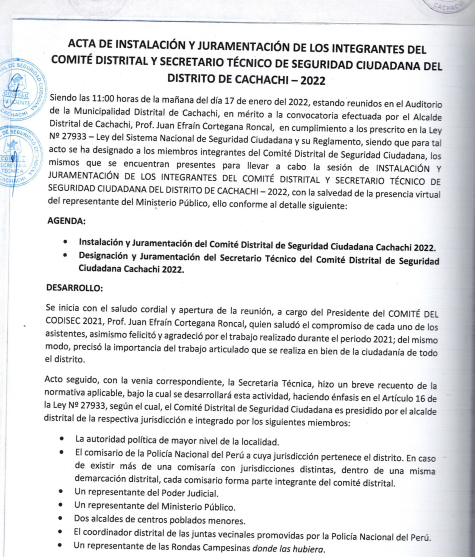Siendo la 11:00 horas de la mañana del dia 17 de enero del 2022, estando reunidos en el auditorio de la Municipalidad Distrital de Cachachi, en merito a la convocatoria efectuada por el Alcalde Distrital de Cachachi, Prof. Juan Efrain Cortegana Roncal