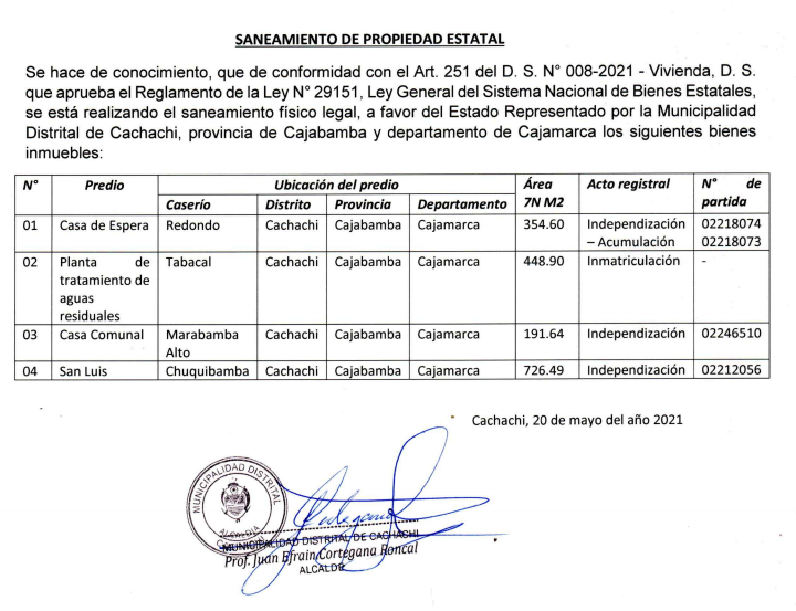 Se hace de conocimiento que de conformidad con el Art. 251 del D.S. Nº 008-2021 - Vivienda, D.S. que aprueba el Reglamento de la Ley Nº 29151, Ley General del Sistema Nacional de Bienes Estatales, se está realizando el saneamiento físico legal, a favor del Estado, representado por la Municipalidad Distrital de Cachachi