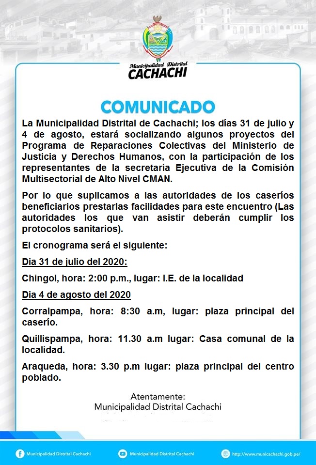📣📣Con éxito la Municipalidad Distrital de Cachachi; viene desarrollando la socialización de algunos proyectos en los caseríos beneficiados por el Programa de Reparaciones Colectivas del Ministerio de Justicia y Derechos Humanos. Los proyectos, que hasta el momento se vienen alistando de acuerdo a las necesidades de las comunidades, son de infraestructura.📣📣
