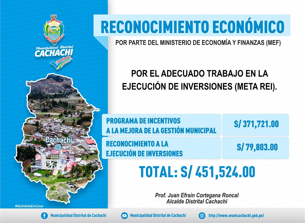 📢‼️𝗠𝗨𝗡𝗜𝗖𝗜𝗣𝗔𝗟𝗜𝗗𝗔𝗗 𝗗𝗜𝗦𝗧𝗥𝗜𝗧𝗔𝗟 𝗗𝗘 𝗖𝗔𝗖𝗛𝗔𝗖𝗛𝗜 𝗔𝗟𝗖𝗔𝗡𝗭𝗔 𝗥𝗘𝗖𝗢𝗡𝗢𝗖𝗜𝗠𝗜𝗘𝗡𝗧𝗢 𝗔 𝗟𝗔 𝗘𝗝𝗘𝗖𝗨𝗖𝗜Ó𝗡 𝗗𝗘 𝗜𝗡𝗩𝗘𝗥𝗦𝗜𝗢𝗡𝗘𝗦 𝗗𝗘𝗟 𝗔Ñ𝗢 𝟮𝟬𝟭𝟵 📢‼️ • Trabajo coordinado entre municipalidad y población rindió frutos. La Municipalidad Distrital Cachachi, recibe reconocimiento económico a su presupuesto por parte del Ministerio de Economía y Finanzas (MEF), por el adecuado trabajo en la ejecución de inversiones, consistente en la ejecución en inversiones en el año 2019. Además el distrito, también logró acceder a un incentivo económico del Programa de Incentivos a la Mejora de la Gestión Municipal, implementado por el gobierno central, que premia a los gobiernos municipales por el cumplimiento de metas, realizadas en el 2019. El gobierno municipal de Cachachi, obtuvo la suma de 371,721.00 soles del Programa de Incentivos a la Mejora de la Gestión Municipal y 79,803.00 soles del Reconocimiento a la Ejecución de Inversiones; haciendo la suma de 451,524.00 soles, que serán invertidos en obras para el distrito. Estos resultados están contenidos en la Resolución Directoral Nº 0018-2020-EF/50.01 que aparece publicada en el diario oficial “El Peruano” que aprueba los resultados complementarios de la evaluación del cumplimiento de las metas del Reconocimiento a la Ejecución de Inversiones (REI). Por otro lado el alcalde del distrito de Cachachi Prof. Juan Efraín Cortegana Roncal, destacó el trabajo coordinado entre municipalidad y población, lo que ha permitido ejecutar con eficiencia y responsabilidad los recursos asignados para el rubro inversiones. Así mismo, expresó que el reconocimiento económico que recibe la municipalidad lo motiva y compromete, a seguir trabajando para traer mayores recursos para beneficio de la población cachachinense.