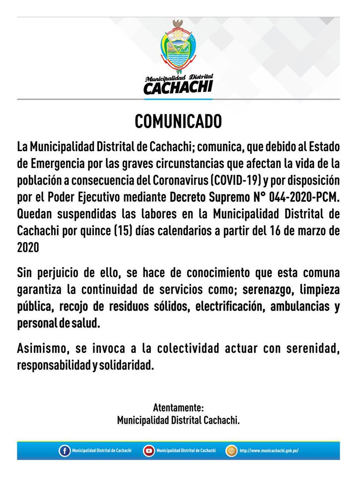 𝐌á𝐬 𝐝𝐞 𝐒/ 7 𝐌𝐢𝐥𝐥𝐨𝐧𝐞𝐬 𝐝𝐞 𝐬𝐨𝐥𝐞𝐬 𝐩𝐚𝐫𝐚 𝐨𝐛𝐫𝐚𝐬 𝐞𝐧 𝐂𝐚𝐜𝐡𝐚𝐜𝐡𝐢. Ante las gestiones del Alcalde del distrito Prof. Juan Efraín Cortegana Roncal, la Autoridad para la Reconstrucción con Cambios (RCC) transfirió más de 7 millones de soles a la Municipalidad de Cachachi, para ejecutar dos proyectos de reconstrucción, que iniciarán en las próximas semanas, generando fuentes de trabajo a la población del distrito.. De acuerdo a los DECRETOS SUPREMOS Nº 021 -2020-EF Y Nº 044-2020-EF; las obras que se ejecutarán son “REHABILITACIÓN DEL SERVICIO DE EDUCACIÓN EN LA I.E SECUNDARIA CESAR VALLEJO EN EL C.P. ARAQUEDA DEL DISTRITO CACHACHI” (MONTO S/ 3,518,868) Y "RECONSTRUCCIÓN DE LAS CALLES DE LA LOCALIDAD DE CACHACHI", (MONTO S/ 3,707,643).