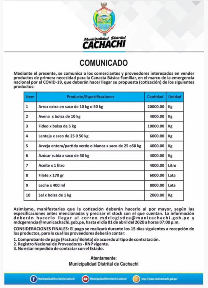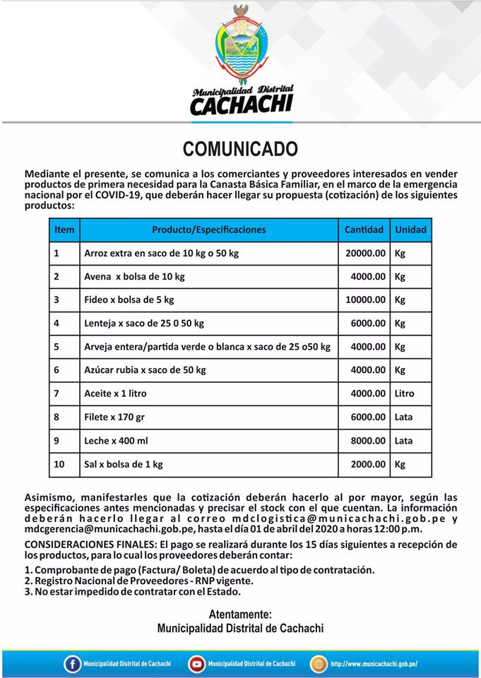 ‼️ COMUNICADO PARA PROMOVER LA PARTICIPACIÓN DE LOS PEQUEÑOS y MEDIANOS PRODUCTORES / COMERCIALIZADORES DE LA PROVINCIA Y DISTRITO. ‼️ Invitamos a los proveedores de la provincia a participar de la presente convocatoria, en tal sentido, esperamos sus propuestas económicas.
